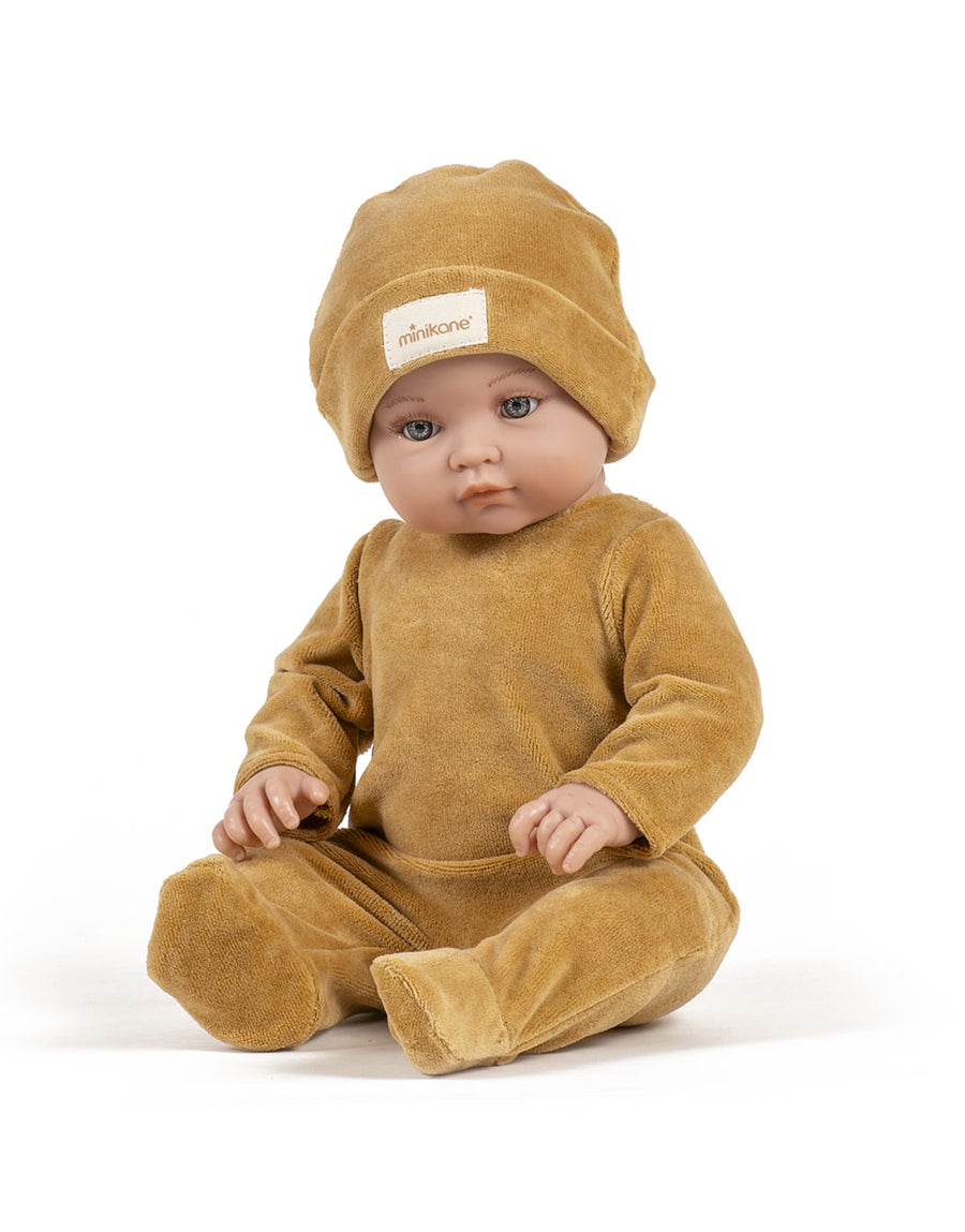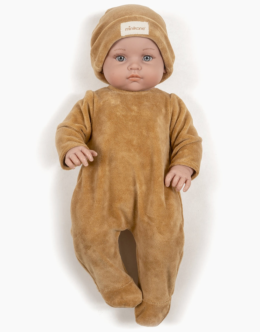 Ensemble Dors bien et bonnet en velours nikky pour poupées et poupons Minikane Bambinis 47cm.