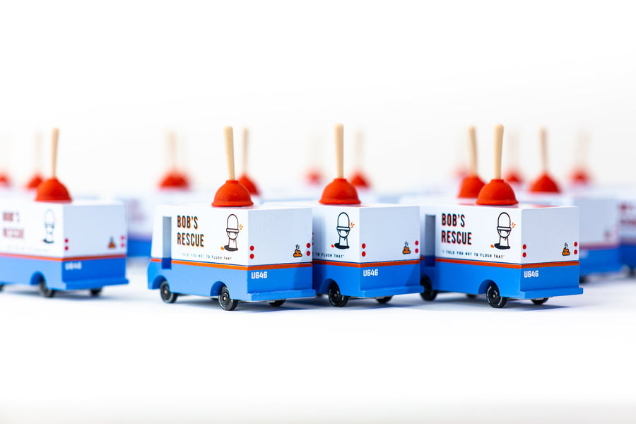 Plumbing truck with a soft silicone rooftop plunger. Includes poop artwork.