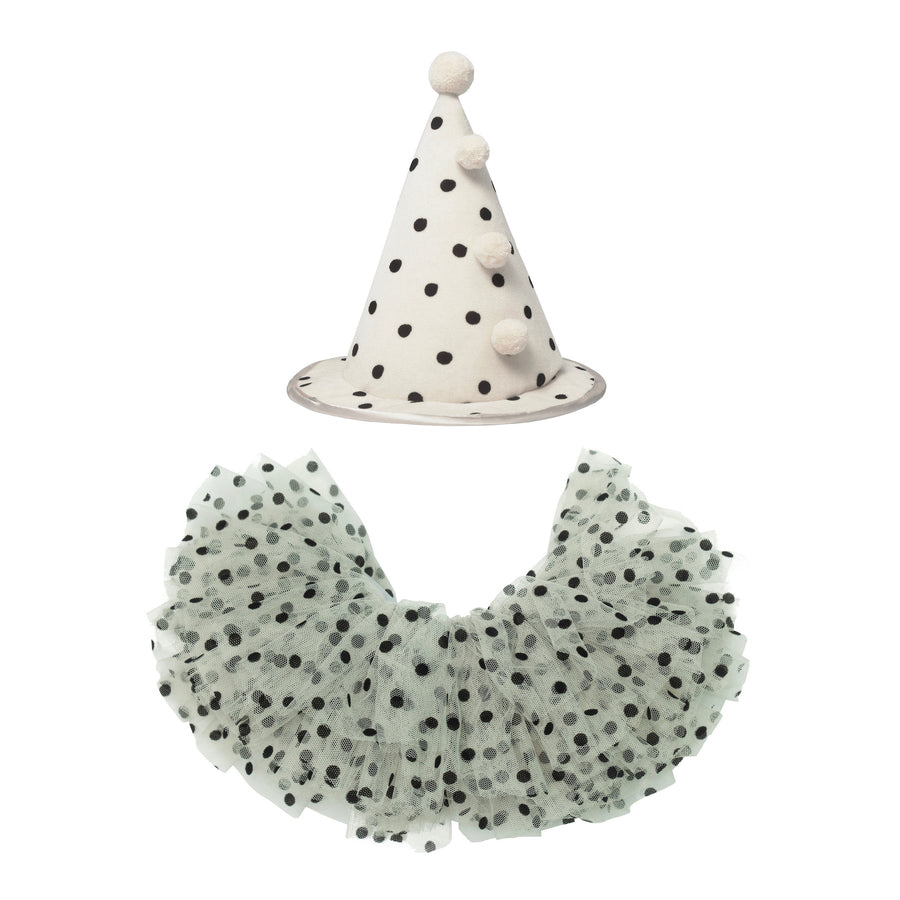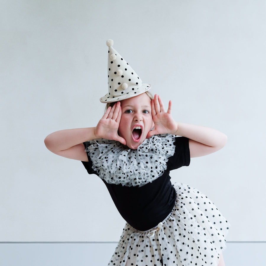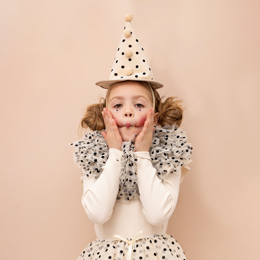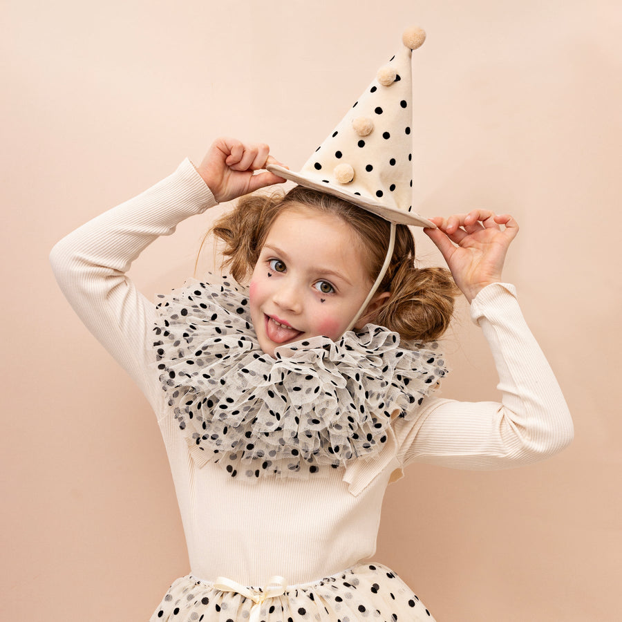 - Black and cream velvet polka dot hat adorned with soft cream pom poms