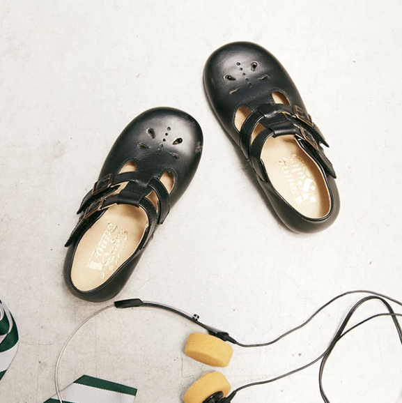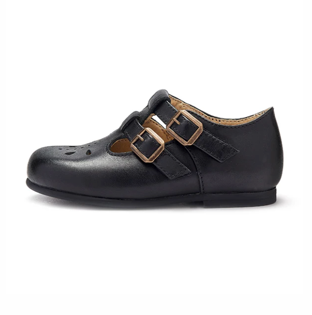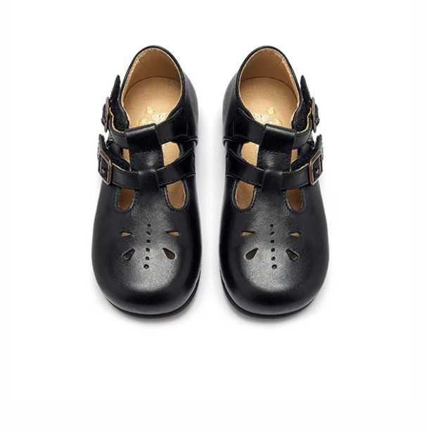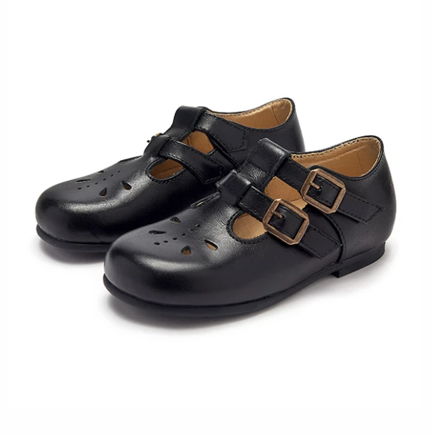Lucy, a classic double-strap T-bar shoe featuring two slim-straps with a cleverly disguised Velcro fastening behind a each buckle, dragonfly punch detail and a lightweight flexible TR Rubber sole.
