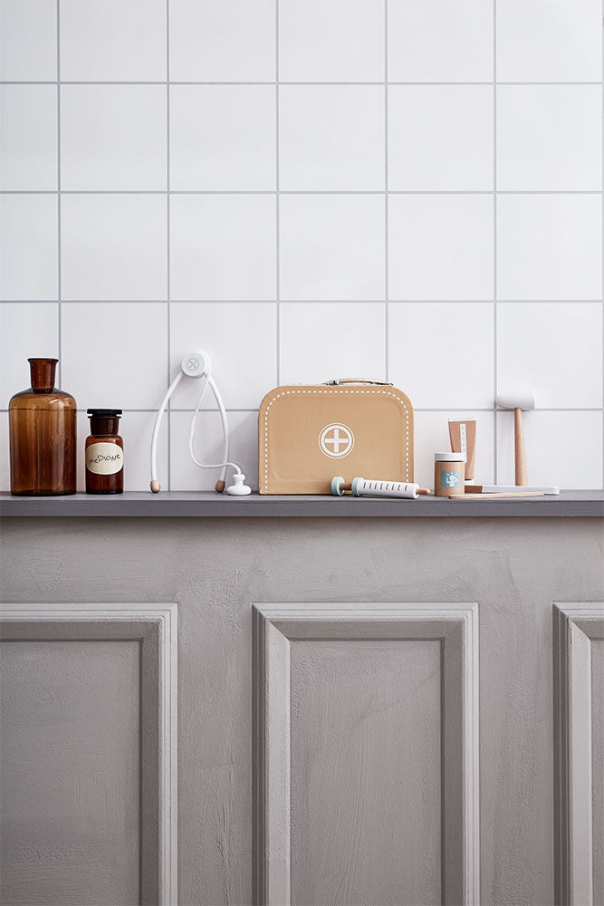 Les enfants adorent jouer au docteur et à l'infirmière. Cette mallette de docteur est un jeu formidable pour stimuler leur imagination. La mallette contient tout l'équipement dont votre petit docteur pourrait avoir besoin pour soigner ses pauvres petits patients. Elle contient 7 accessoires en bois, tous fabriqués magnifiquement à la main, en bois : médicaments, pommade, seringue, marteau à réflexes, stéthoscope, thermomètre et abaisse-langue. La mallette est fabriquée en carton bois renforcé, pour un jeu entièrement durable et amusant - mallette et contenu.