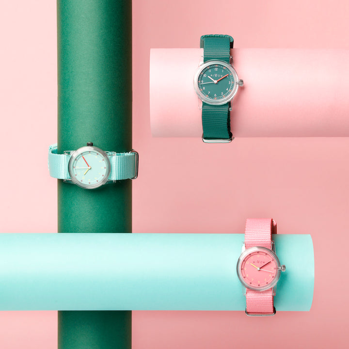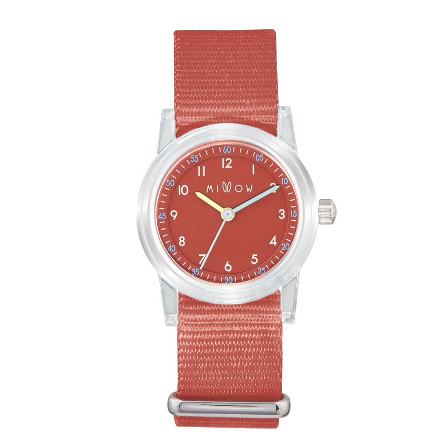 Son boitier transparent et son cadran à la couleur pop est waterproof et ultra léger (le boiter ne pèse que 3 grammes). Son design est également étudié avec une double lecture. Ses aiguilles de couleurs assorties facilitent l'apprentissage de l'heure.
