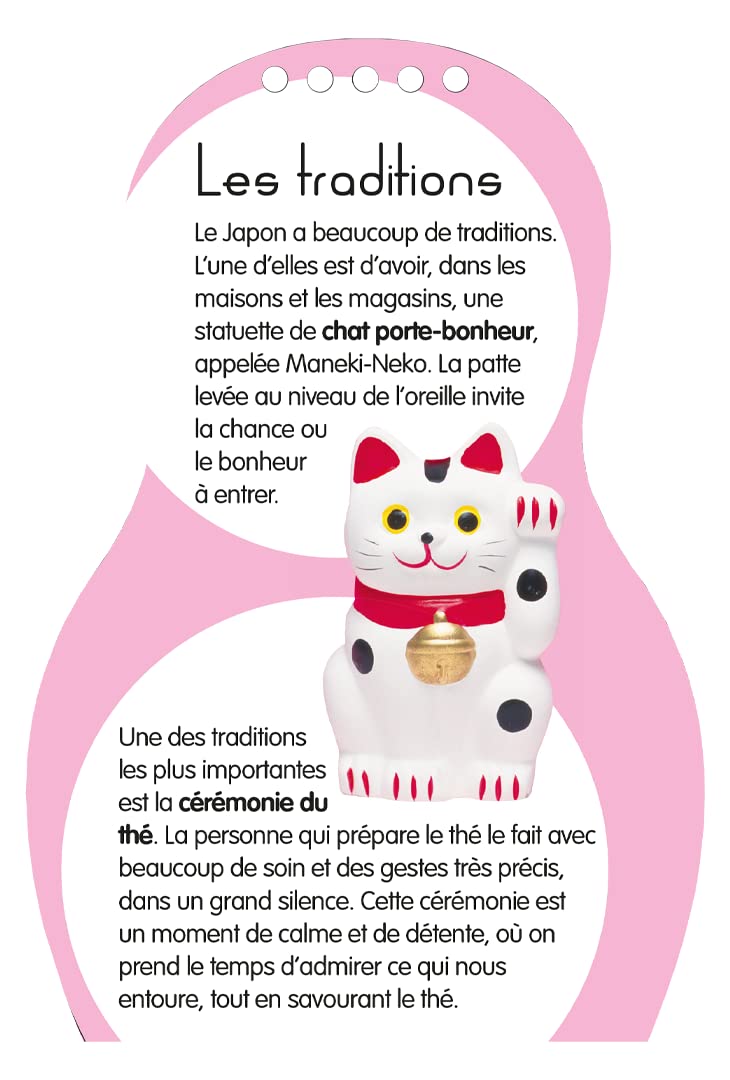 Et en plus, des infos documentaires sur les traditions et les tenues du Japon : les vêtements, l'alimentation, l'école, les jeux, la fête des Poupées.