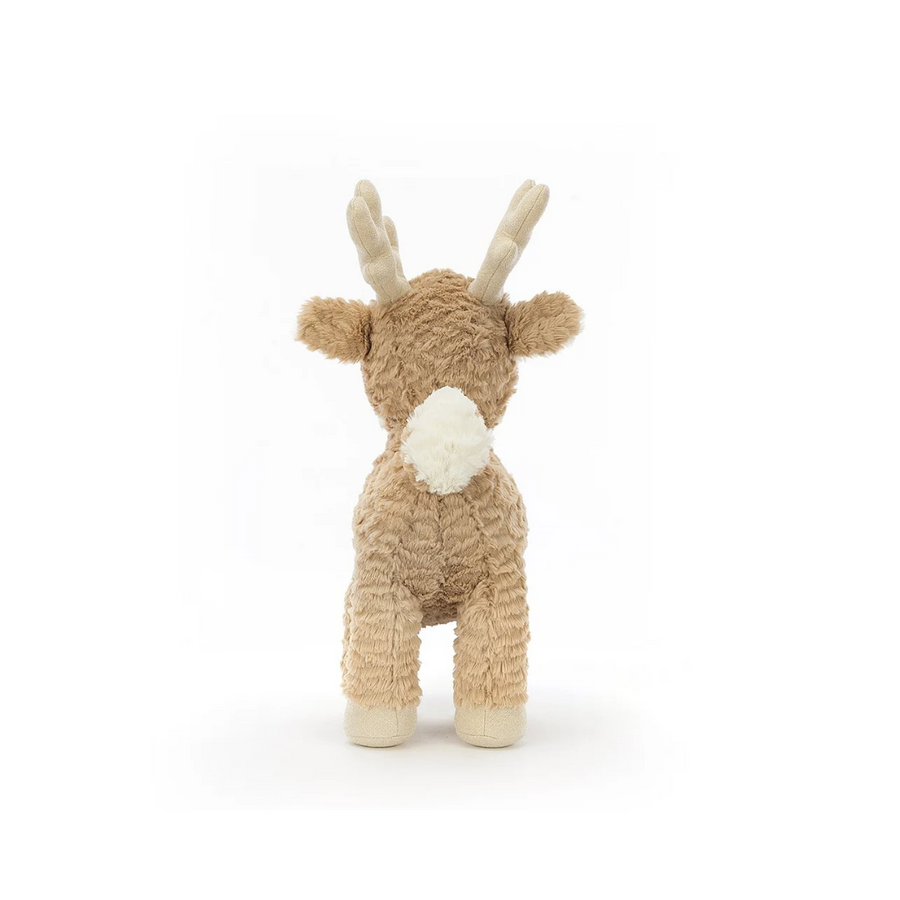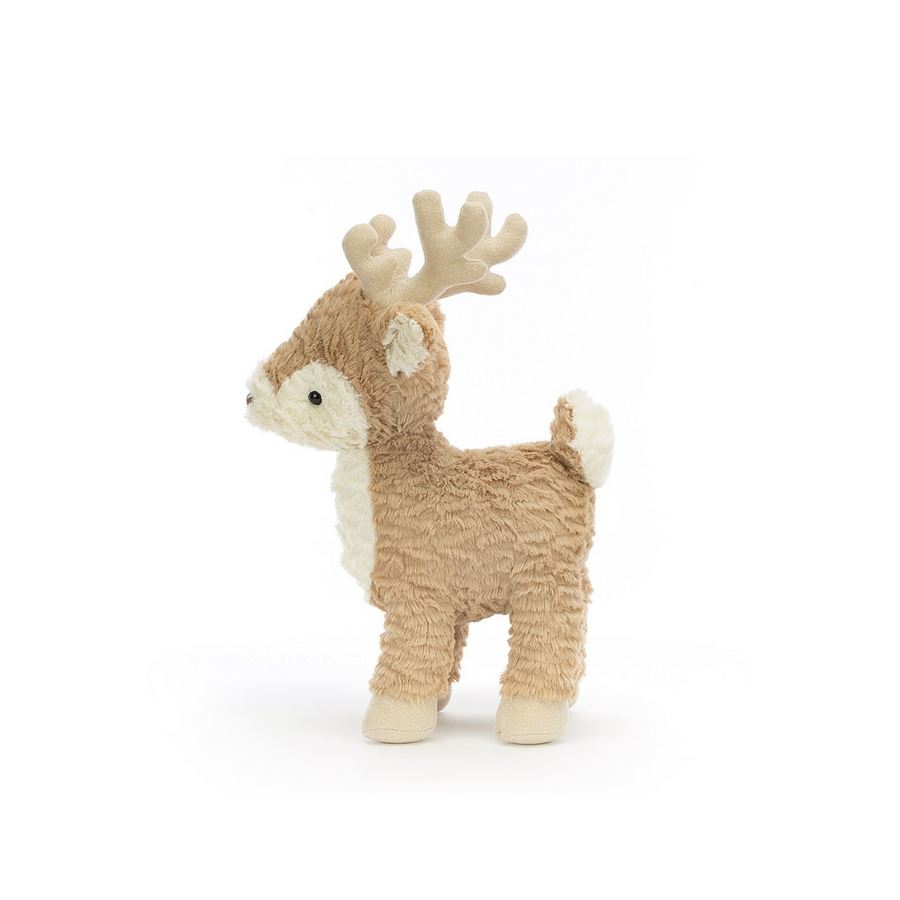 Mitzi Reindeer is rumply-gentle, with tousled cream and caramel fur. A curious cutie, Mitzi stands tall on heart-shaped suedey hooves. With scrummily fluffy waggle ears, butterscotch antlers and a chocolate button nose, this petal-tailed poppet is a tufty treat!