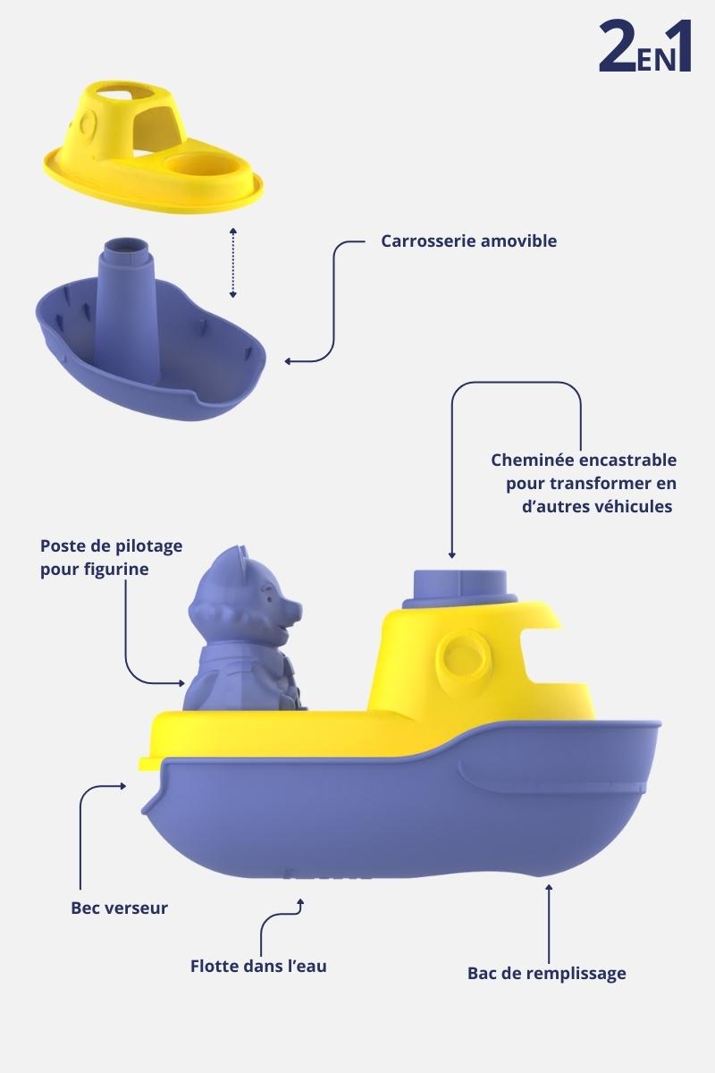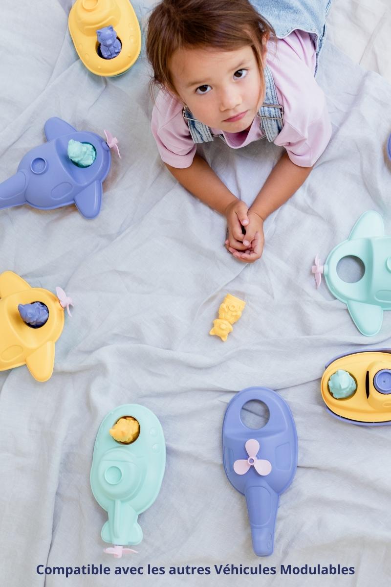 Le bateau, l’un des véhicule préféré des enfants. Ce petit bateau modulable peut se transformer en barques et en d’autres véhicules d’exploration (non-inclus). Sa carrosserie amovible laisse place à une petite barque dans laquelle l’enfant peut stocker des choses ou remplir d’eau. Le capitaine Renard est à la barre et peut aussi s’emboîter sur le mat pour surveiller les environs. À l’abordage ! Monomatière, sans colle, ni vis, ni autocollants ce bateau est parfait pour jouer partout : dans le bain, dehors et à l’intérieur.