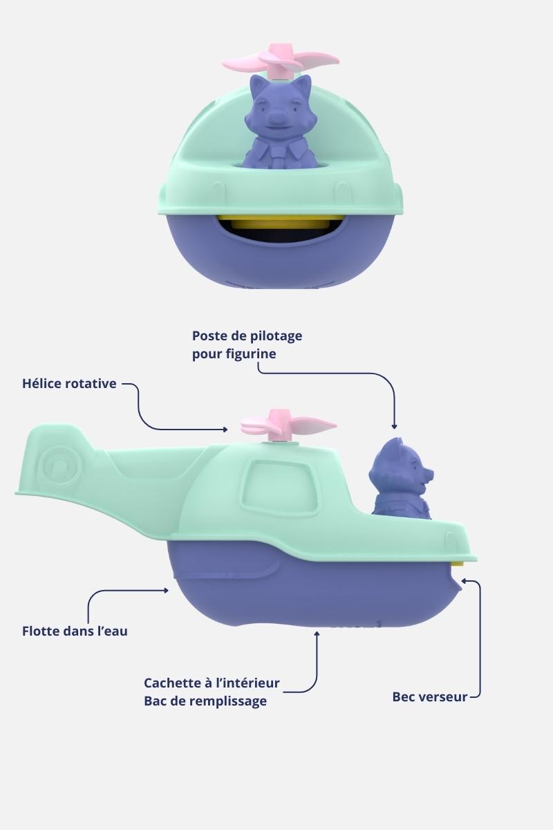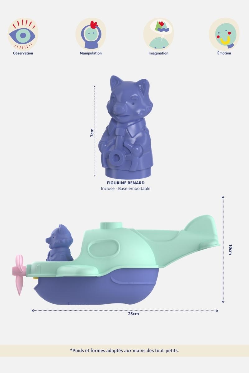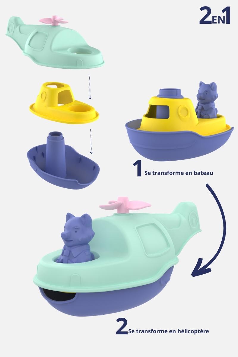 L’hélicoptère 2-en-1 qui se transforme en bateau pour voler au secours dans toutes les conditions. Avec les 3 coques qui s’encastrent les unes dans les autres l’hélicoptère est un formidable véhicule d’exploration. Mono-matière, avec son hélice rotative, il est entièrement lavable et pensé pour jouer partout, dans l’eau comme dans le sable. Il développera la curiosité et la motricité des tout-petits. Accompagné de sa figurine renard encastrable.