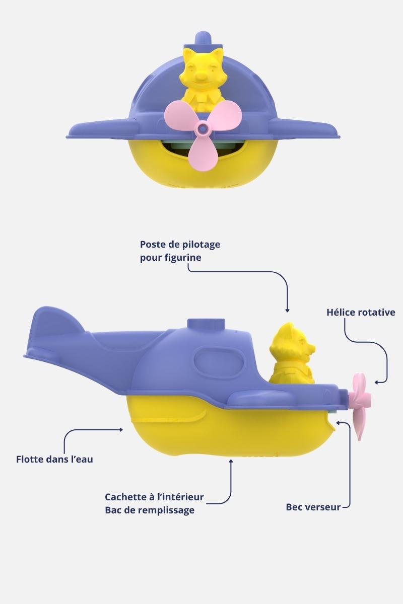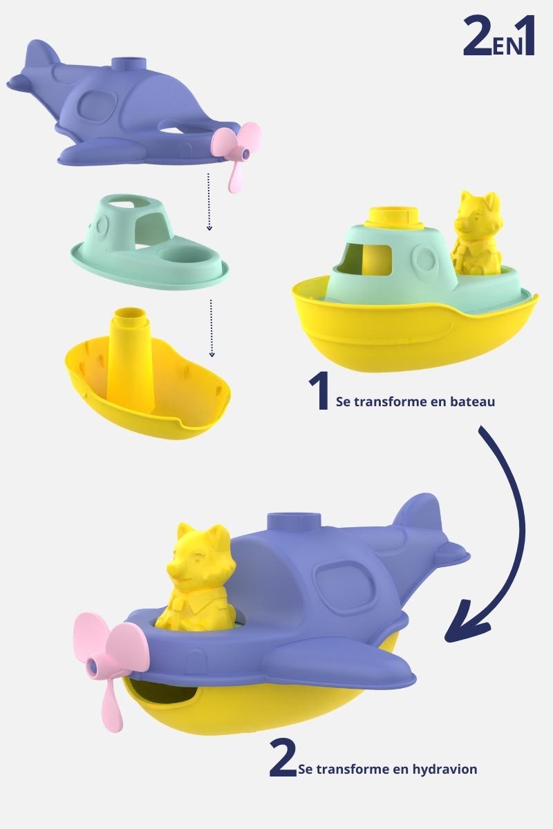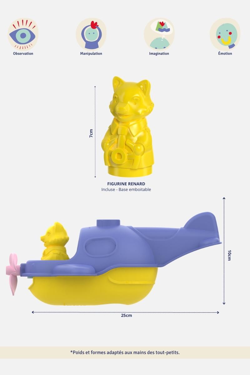 L’hydravion modulable est un véhicule d’exploration 2-en-1 qui se transforme en bateau. 3 coques amovibles composent ce jouet d’éveil conçu pour jouer partout. Dans le bain à l’intérieur et à l’extérieur. Les 3 coques se séparent et permettent à l’enfant de développer sa dextérité et les liens de causes à effet. Muni d’une hélice qui tourne à toute vitesse et de son pilote Renard, l’hydravion est paré à toutes les aventures.