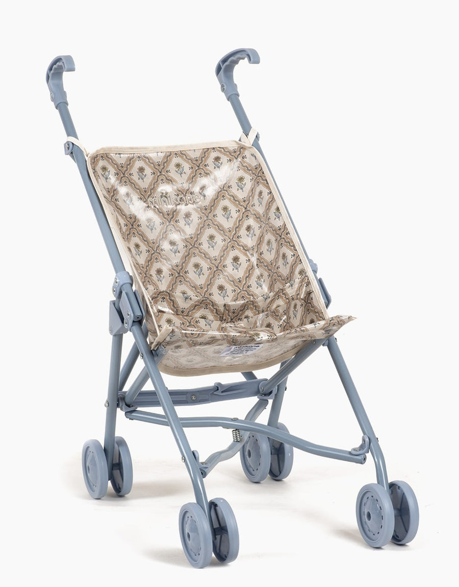 Jouet poussette pliable pour poupée et poupon avec assise en coton enduit.