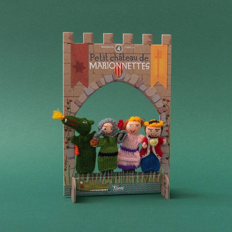 4 marionnettes à doigts de princesses et de chevaliers et un théâtre en carton en forme de château. Idéal pour stimuler la créativité et inventer des histoires.